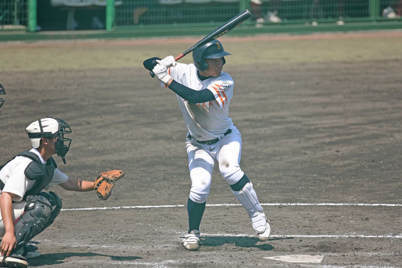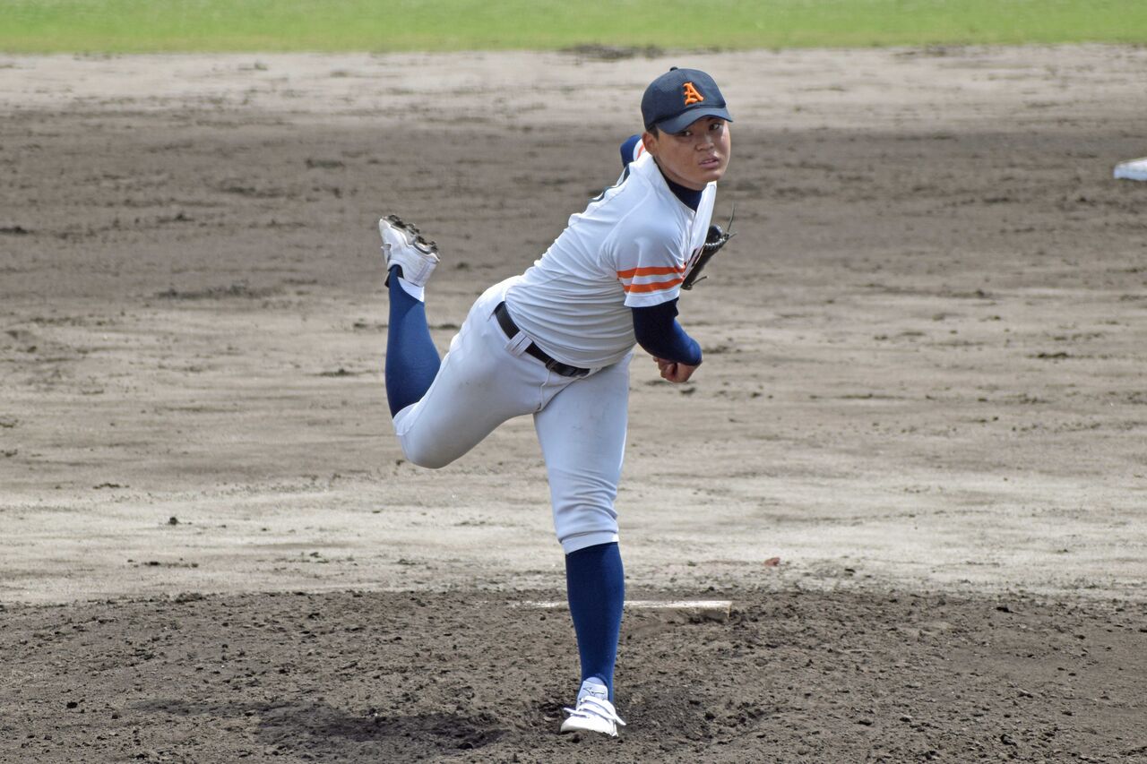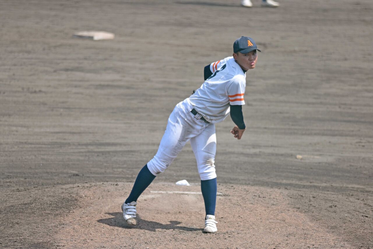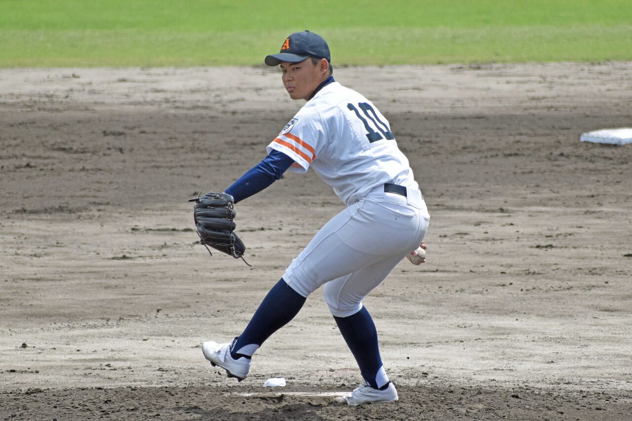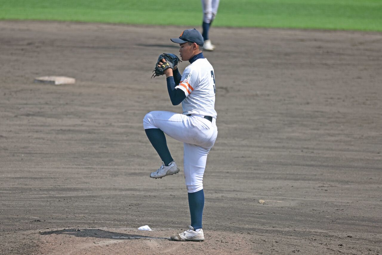 右のスリークォーターからまっすぐは120㎞前半くらいでしたが、ボールが動いている感じで空振りも取っていました。まずまず身体もありますし、球威が上がってこれば、秋以降も楽しみな投手。