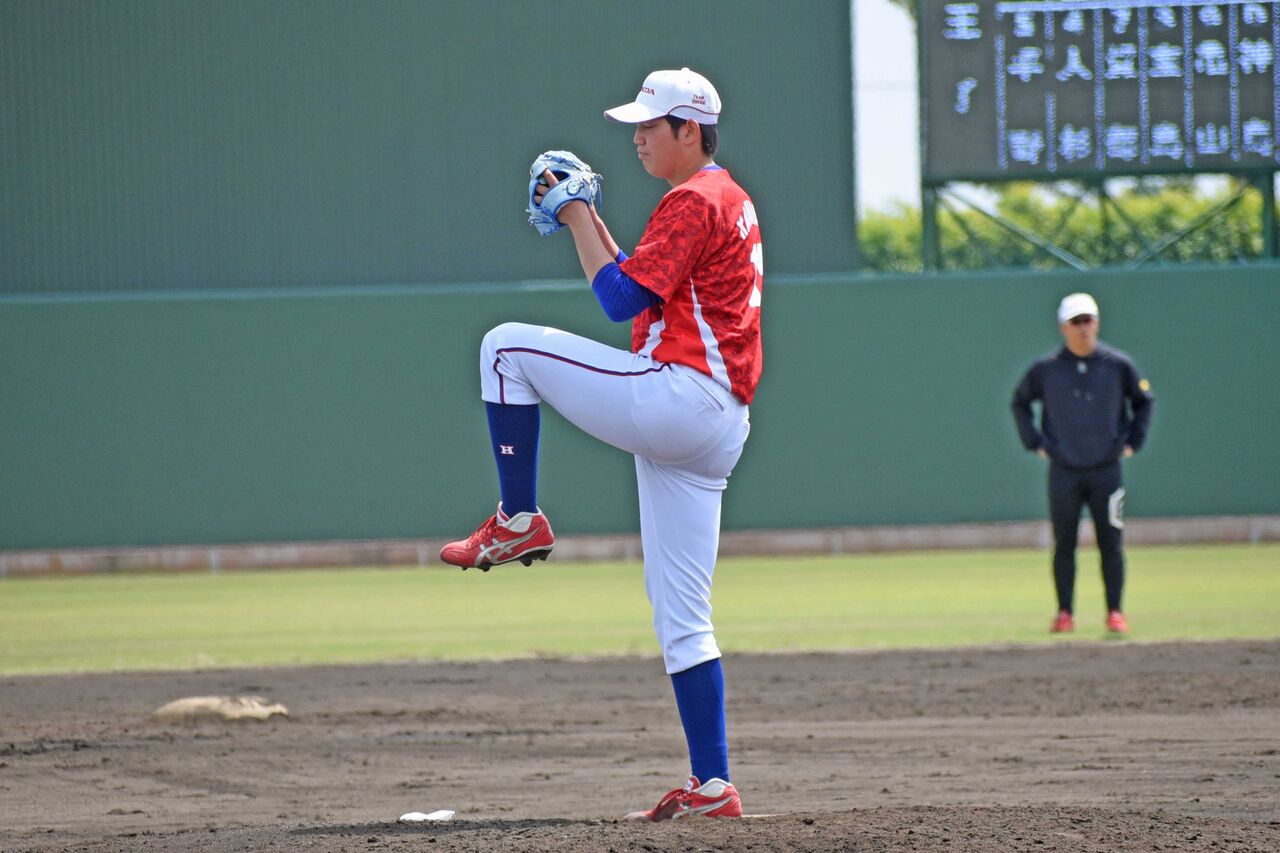 高卒1年目とは思えない体格から投げ下ろすフォームが特徴的。MAXは143㎞。追い込んでから苦労していましたが、これも経験ですね。社会人相手に投げて抑える術を身に着けることも大事ですけど、やはりスケールをさらに大きくする努力をしてほしいです。